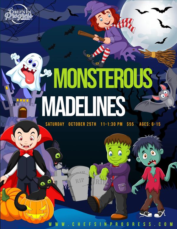 Join us for a frightfully fun Halloween baking class where kids will transform soft vanilla bean madeleine cookies into wild, colorful