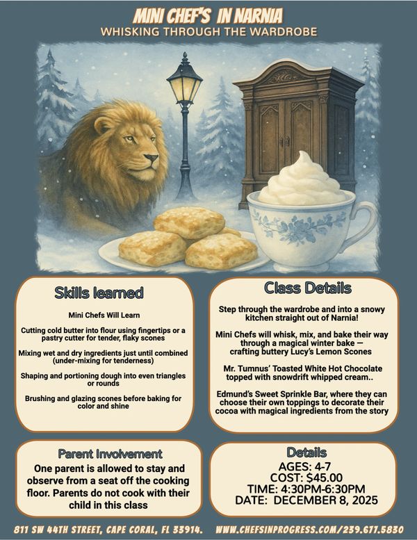 This whimsical, hands-on class blends storytelling and baking as young chefs learn to cut cold butter into flour, shape and bake their own scones, and safely whisk warm cocoa on the stove. It’s a cozy afternoon of pastry, play, and winter wonder.