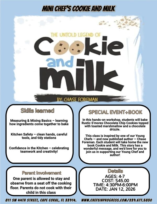 This class is inspired by one of our Young Chefs — and now published author — Chase Foreman. Each student will take home the new book Cookie and Milk. This story has a wonderful message, and we’d love for you to join us in supporting our Young Chef and author!